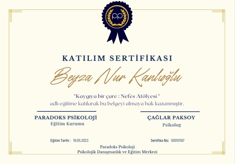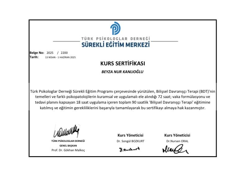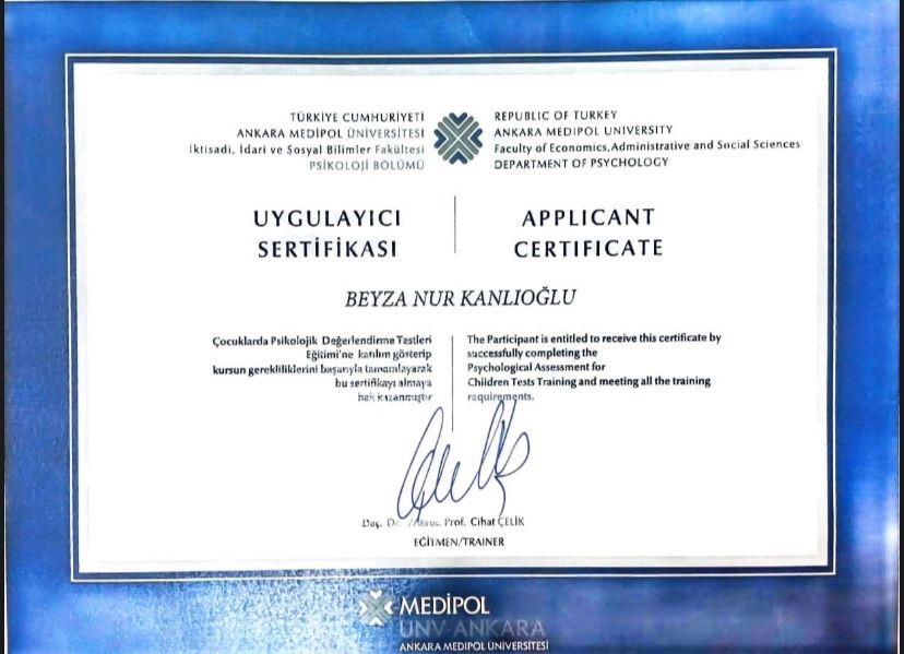 Ben Psikolog Beyza Nur Kanlıoğlu. Ankara Medipol Üniversitesi Psikoloji Bölümü’ne tam burslu olarak ikinci sıradan yerleştim ve Yüksek Onur Öğrencisi unvanıyla mezun oldum. Lisans eğitimim süresince TÜBİTAK projesi dahil olmak üzere birçok akademik çalışmada yer aldım ve bu sayede alandaki bilgi ve deneyimimi derinleştirme fırsatı buldum. Eğitim hayatım boyunca çeşitli kurumlarda gerçekleştirdiğim stajlarla mesleki gelişimimi pekiştirdim. Özellikle Nazilli Devlet Hastanesi ve çeşitli özel danışmanlık merkezlerinde yaptığım uzun dönemli stajlar sayesinde geniş bir vaka yelpazesinde deneyim kazandım. Akademik başarım sayesinde Türk Psikologlar Derneği tarafından ücretsiz olarak sağlanan “Çocuklarda Psikolojik Testler” eğitimine katılma hakkı elde ettim ve bu kapsamda çocuklara uygulanan 15 farklı testin uygulayıcısı oldum. Ayrıca yine Türk Psikologlar Derneği onaylı 90 saatlik “Bilişsel Davranışçı Terapi” eğitimini başarıyla tamamladım. Halen Luna Psikoloji bünyesinde ve online olarak danışan takibi yapmaktayım. Bununla birlikte, Türk Psikologlar Derneği onaylı Bilişsel Davranışçı Psikoterapi Eğitimi, Türk Psikologlar Derneği onaylı Çocuklarda Psikolojik Testler Uygulayıcılığı, yine Türk Psikologlar Derneği onaylı Özgül Öğrenme Bozukluğu Testi Uygulayıcılığı ve Kısa Süreli Çözüm Odaklı Terapi eğitimlerine de sahibim.